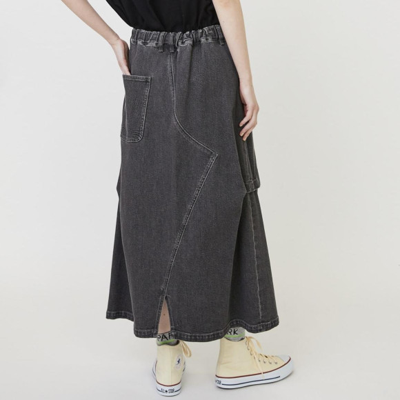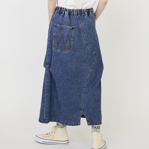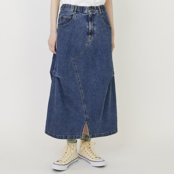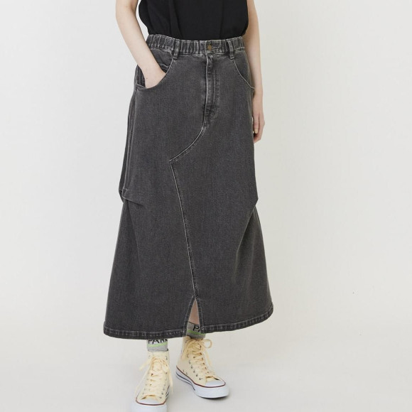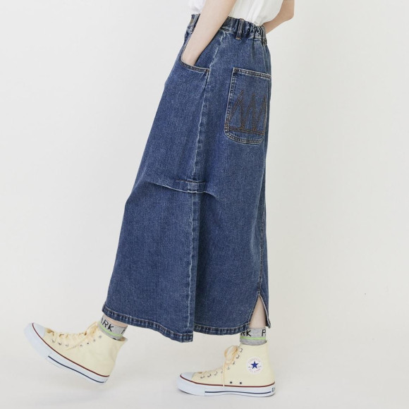 Design: A denim skirt that is eye-catching with a unique switch that looks as if it were dismantled and remaked denim pants. It has a nice, relaxed, narrow silhouette with a tuck on the side to create an accent. The elastic waist and elastic cord make this item a nice item.