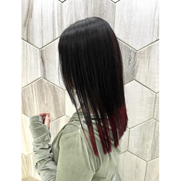 The hair tip was bleached once, then the cherry red color was put on, and the whole was calmed down to black.☆