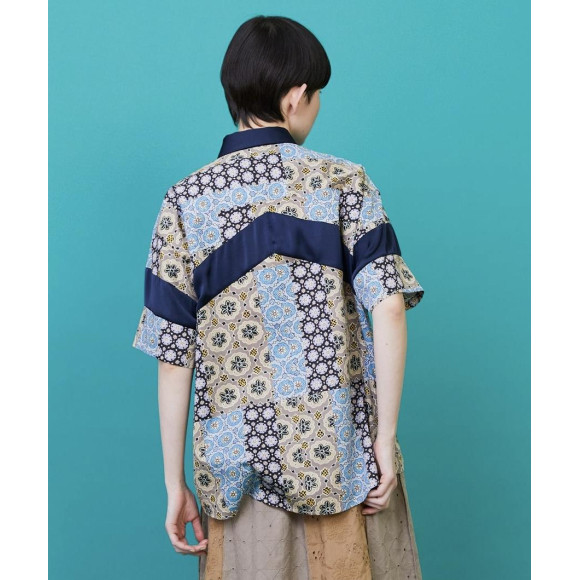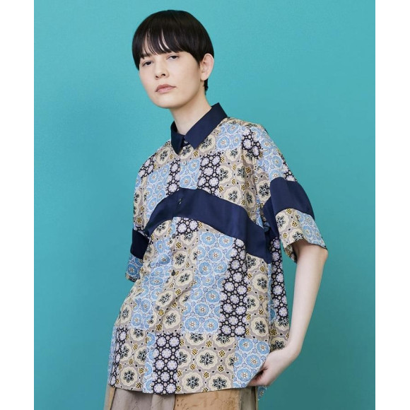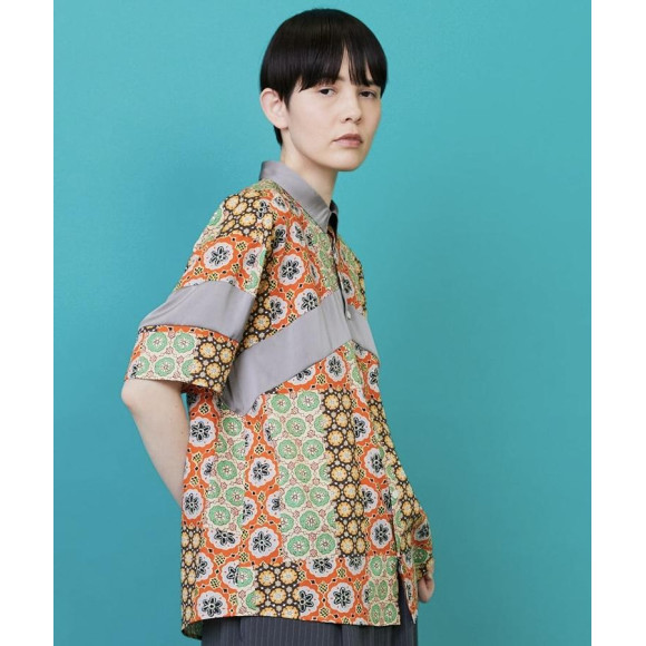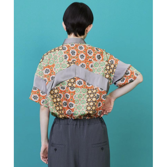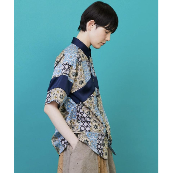 [Design] Based on a loose, relaxed silhouette shirt blouse, a line-shaped switch is added, and plain material is incorporated into it to accentuate it. Combining an impactful pattern with a nuanced plain, creates a modest atmosphere.