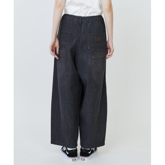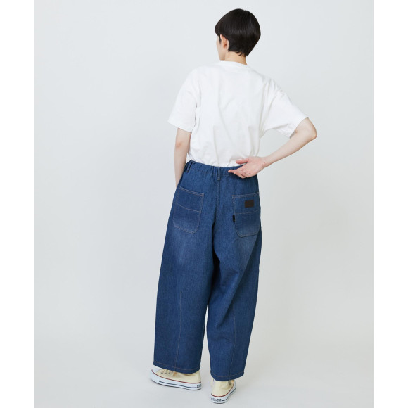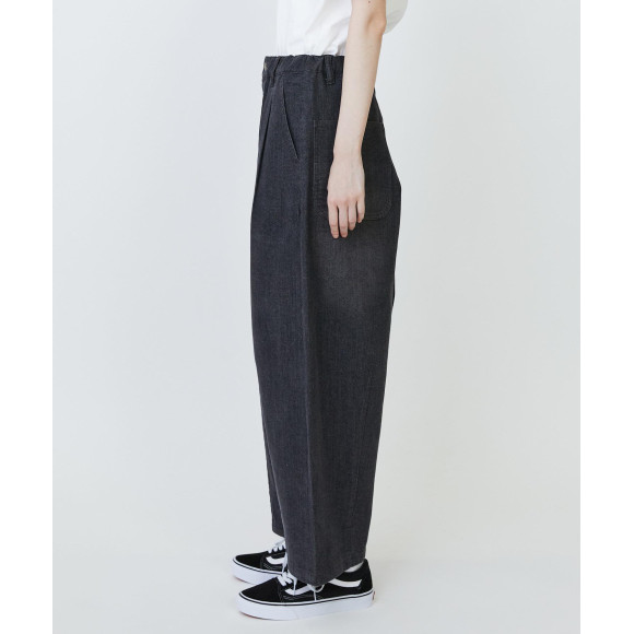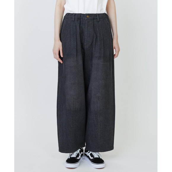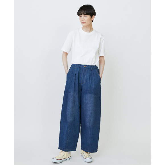 [Design] "Moment Denim" is now available from the popular denim pants series in FRAPBOIS. The wide tapered silhouette, which had never been before, creates a solid look with the tuck at the front, while the darts taken before and after the hem give a gentle and calm tapered feeling. The waist is easy to make with rubber and strings, and the elasticity of the material itself is comfortable to wear, and it is also nice to wear. In addition, the original patch of the hip pocket creates an accent casually. There are plenty of sizes available, so you can enjoy choosing a size in your favorite atmosphere. Available in two colors: blue with a calm texture that looks mature and black with an old processing that is not too heavy.