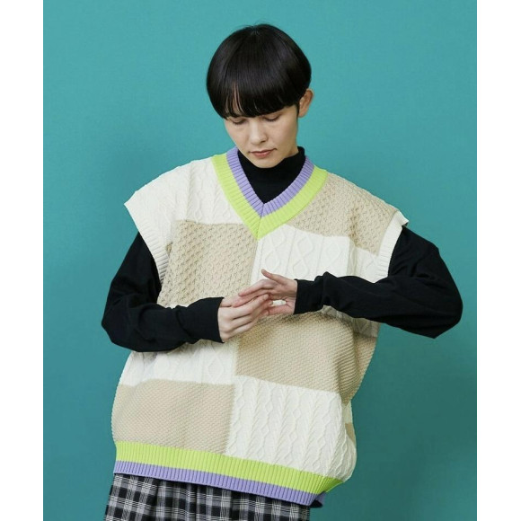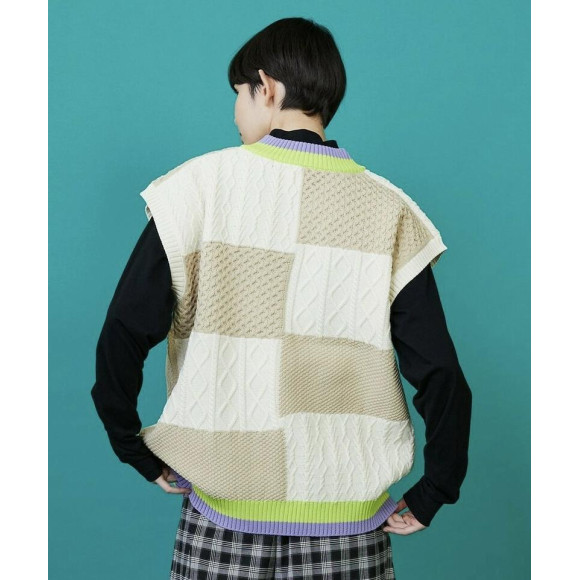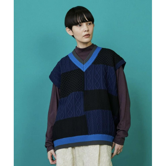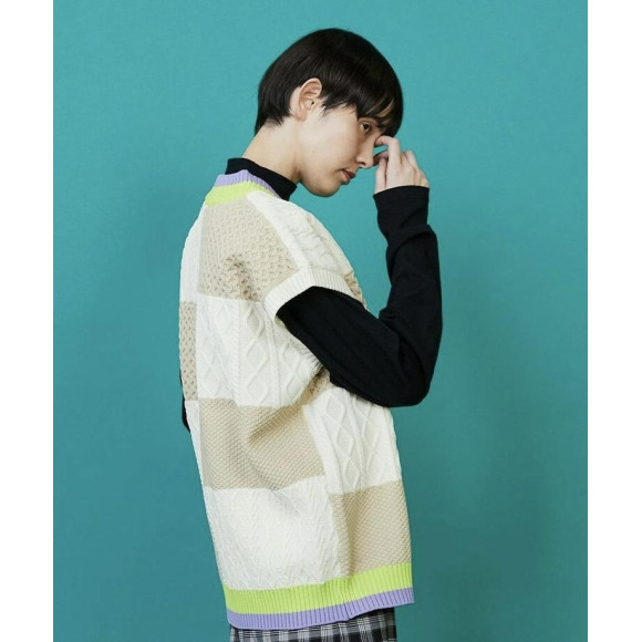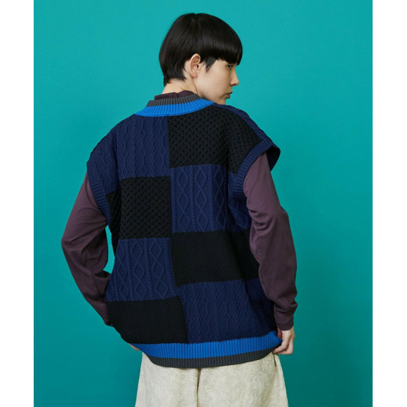 [Design] A design vest that combines several cable knitting in a block shape and features a beautiful color scheme.