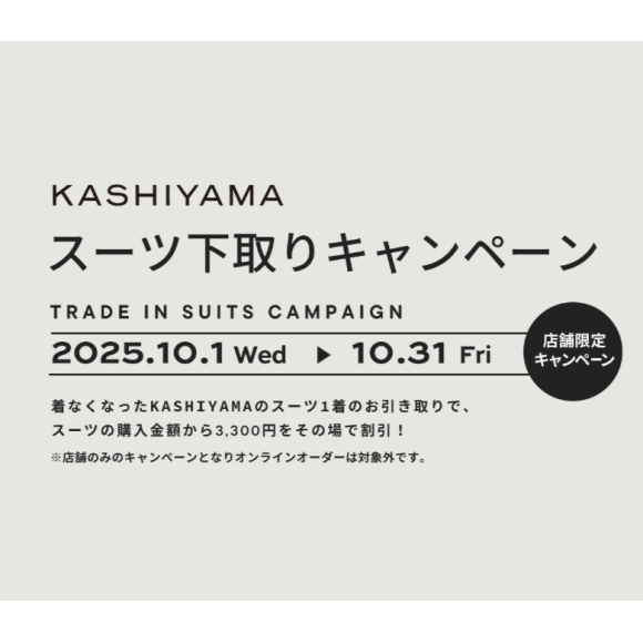 By trade-in KASHIYAMA's suit that you no longer wear, you will receive a discount of 3,300 yen on the spot from the purchase price of the suit. The suit you picked up in the trade-in will be recycled responsibly in an on-word personal style. Please take this opportunity to take advantage of the suit trade-in campaign.