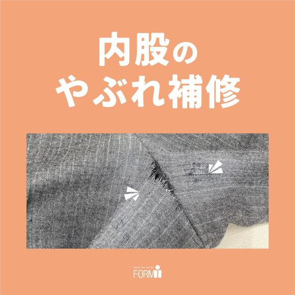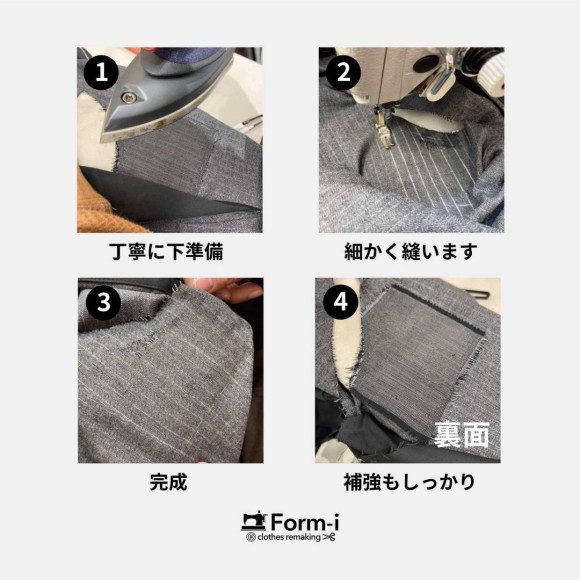 If the fabric becomes thin as shown in the photo, apply it to the back and sew it finely with a sewing machine. You can see the sewing machine, but the hole is blocked. It can also be reinforced, so it is recommended for those who want to go out with suit pants or favorite clothes for a long time. (* If there is a symbiotic place, please bring it with you when you visit the store.)